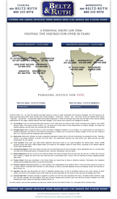 Tampa Personal Injury Lawyers Personal Injury Attorney in Tampa Accident Lawyer Car Accidents Truck Accidents motorcycle accidents product liability premises liability Beltz & Ruth 800-BeltzRuth 800-235-8978 727-327-3222 P.O. Box 16847 St. Petersburg FL 33733-6847