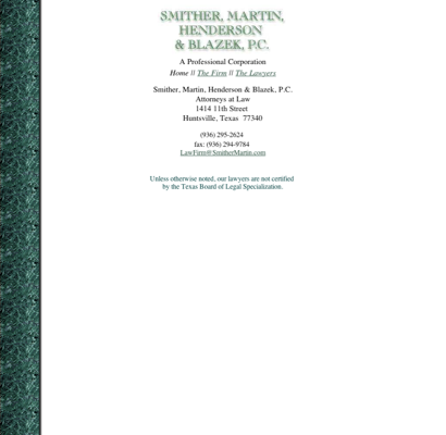 You can reach us on phone number (936) 295-2624, fax number (936) 294-9784 or email address frankblazek@smithermartin.com. Our office is located on 1414 11th St, Huntsville, TX,