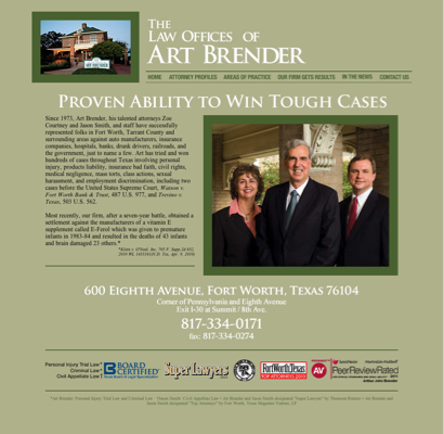Lawyer Attorney Personal Injury Class Action Probate Employment Product Liability Medical Malpractice Criminal Defense Art Brender Jason Smith Zoe Courtney Fort Worth Dallas Law Firms Trial Lawyers Board Certified Legal Advice