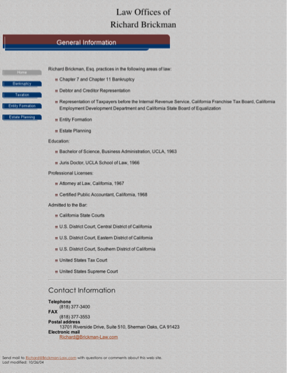 Brickman Richard Law Offices Of is listed under Bankruptcy Attorneys in Sherman Oaks, California .