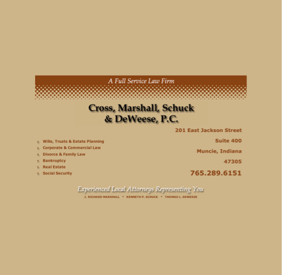 You can reach us on phone number (765) 289-6151, fax number (765) 289-6158 or email address tldeweese@crossmarshall.com. Our office is located on 200 E Washington St, Muncie, IN,