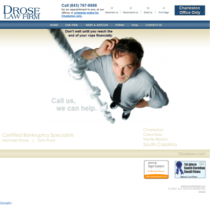 bankruptcy attorney lawyer attorneys lawyers bankrupt South Carolina South Carolina SC Columbia Myrtle Beach North Charleston Charleston creditor law firm chapter 7 chapter 13 bankruptcy attorney bankruptcy lawyer bankruptcy law law firm bankruptcy laws wage earner liquidation debtor debt consolidation bill bills court legal advice plan foreclosure repossession foreclose repossess house car liens tax bill consolidation credit cards debt relief security file credit judgement judgements garnishment garnish keep payments harassing property Michael Drose Beth Grzybowski Tom Fryar protect threatening bankruptcy code benefits aty atty atny attny atorney bankrut bankrutcy bankrupcy bankrutpcy drose law firm myrtle beach