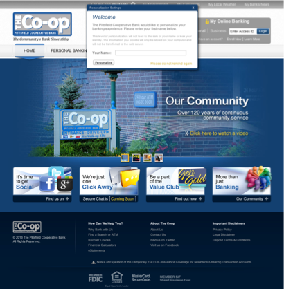 Berkshire Pittsfield Dalton Great Barrington GB Barrington Hinsdale Banking Services Bank Banks telephone banking internet banking bill pay billpay quicken quickbooks e-Banking eBanking Commercial Loans Business Banking Home Equity Mortgages Checking Savings Passbook Debit Cards ATM Cards ATM Money Order FDIC SIF Loans The Co-Op Pittsfield Co-Op Pittsfield Bank Co-Op Pittsfield Coop The Coop